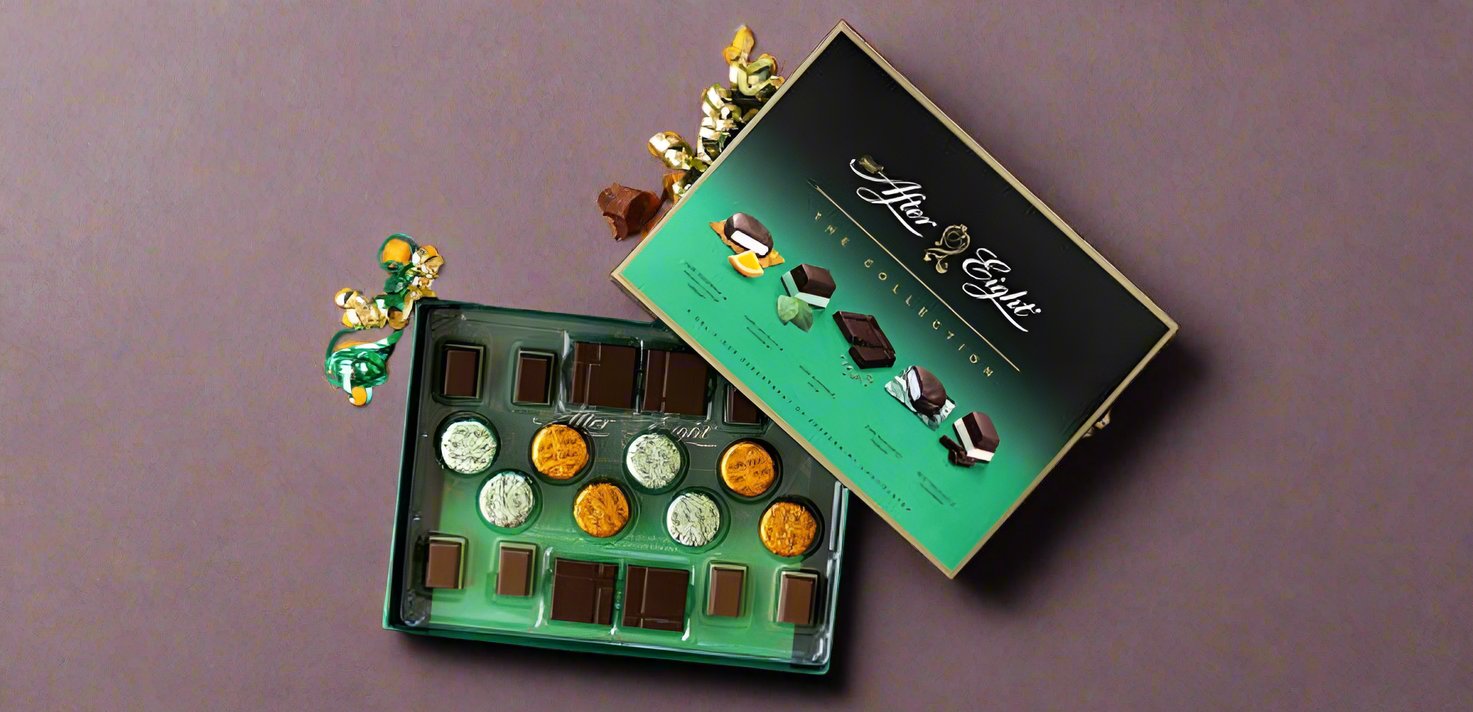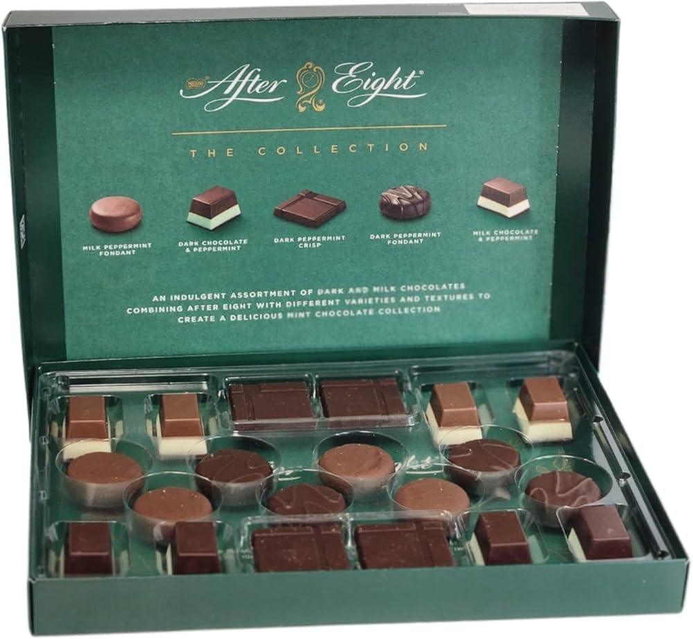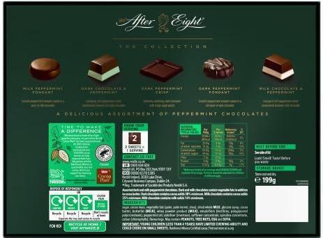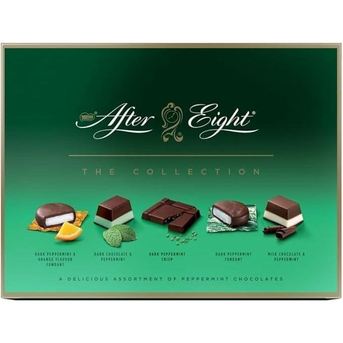 The Inlaid Box Selection 199g bundle consisting of After Eight is an exquisite assortment of luxurious dark chocolates filled with smooth peppermint cream, offering a sophisticated and indulgent treat. Created by After Eight, a renowned confectionery brand with a legacy of elegance, this bundle provides a selection of fine chocolates that are perfect for special occasions or moments of self-indulgence. After Eight offers a delicious assortment of peppermint chocolates. Select from 5 delicious peppermint chocolates. Milk Peppermint Flavour - Smooth peppermint fondant coated in a layer of milk chocolate Dark Chocolate & Peppermint - Indulgent soft peppermint centre sandwiched between rich dark chocolate Dark Peppermint Crisp - Intensely satisfying, dark chocolate with crispy sugar pearls Dark Peppermint Fondant - Smooth peppermint fondant coated in a rich layer of dark chocolate Milk Chocolate & Peppermint - Indulgent soft peppermint centre sandwiched between milk chocolate.