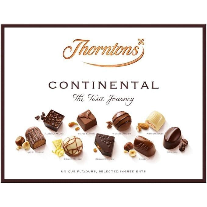 Product Description An Assortment of Milk, Dark and White Chocolates Discover our exclusive range, including personalised chocolates, hampers and more at thorntons.com The Taste Journey Our chocolate makers crafted this much-loved continental range, inspired by travelling across Europe in search of rich and delicate taste experiences. They combined these influences, their passion and years of expertise to create special recipes of beautifully crafted chocolates, using carefully selected ingredients. At Thorntons we put a lot of love, passion and care into all we do, we would like to invite you to enjoy with us our journey through excellence. Unique flavours, selected ingredients, Sicilian mousse, Seville caramel, Viennese deluxe, Hazelnut milano, Gianduiot, Espresso, Salted caramel, Alpini praline, Amaretti crisp Design 22 Pass the love on Suitable for vegetarians The Taste Journey Pack size: 264G Ingredients Sugar, Cocoa Butter, Cocoa Mass, Dried Whole Milk, Hazelnuts, Vegetable Fats (Palm, Palm Kernel), Butter (Milk), Dried Skimmed Milk, Glucose Syrup, Fat Reduced Cocoa Powder, Sweetened Condensed Milk (Whole Milk, Sugar, Lactose (Milk)), Double Cream (Milk), Dextrose, Invert Sugar Syrup, Whole Milk, Almonds, Emulsifier (Lecithins (Soya)), Lemon Juice Powder (Maltodextrin, Concentrated Lemon Juice), Roasted Cocoa Nibs, Anhydrous Milk Fat, Maize Starch, Dried Instant Coffee, Concentrated Orange Juice, Flavourings, Salt, Sea Salt, Stabiliser (Invertase), Raising Agent (Ammonium Hydrogen Carbonate), Acid (Citric Acid), Our Chocolate is made with 100% Cocoa Butter, Milk Chocolate contains: Cocoa Solids 30% minimum, Milk Solids 20% minimum, Dark Chocolate contains: Cocoa Solids 48% minimum, Gianduja Milk Chocolate contains: Cocoa Solids 29% minimum, Milk Solids 15% minimum Allergy Information May also contain: Other Nuts, Egg, Cereals containing Gluten. Net Contents 264g ℮
