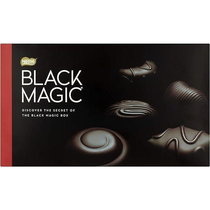 Assorted dark chocolates. Black Magic is part of the Nestle Cocoa Plan, which works with the Rainforest Alliance to ensure a better future for cocoa farmers and even better chocolate for you A classic selection of caramels, wholenuts and fruit creams, wrapped in dark chocolate. Choose from nine different tantalising centres: Coffee Crescent - A sweet coffee centre wrapped in rich dark chocolate Pure Black Magic- An elegant piece of pure dark chocolate Midnight Truffle - A silky smooth truffle, rich with cocoa Almond Crunch - Finely chopped almonds immersed in a truffle filling and wrapped in rich dark chocolate Raspberry Heaven - A fruity burst of raspberry encased in delicious dark chocolate Dreamy Fudge - Soft, creamy fudge enveloped in a dark chocolate coating Hazelnut Swirl - A whole roasted hazelnut set in a heavenly praline, surrounded by a dark chocolate shell Orange Sensation - Soft, tangy orange fondant draped in dark chocolate Caramel Heart - Flowing golden caramel held in a dark chocolate shell. The perfect gift for dark chocolate lovers.